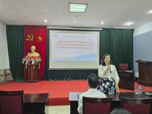 Buổi tập huấn được dẫn dắt bởi ThS. Trần Thị Thu Hà – Chuyên viên cao cấp, nguyên Phó Cục trưởng Cục Kiểm định chất lượng GDNN. Với kinh nghiệm chuyên sâu và kiến thức thực tiễn phong phú, ThS. Trần Thị Thu Hà đã mang đến nhiều thông tin hữu ích, giúp đội ngũ cán bộ, giảng viên hiểu rõ hơn về các tiêu chuẩn, quy trình kiểm định và bảo đảm chất lượng GDNN.